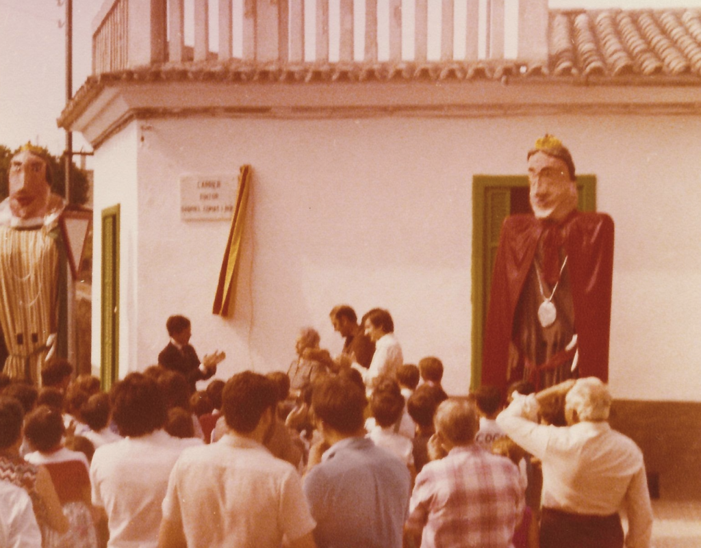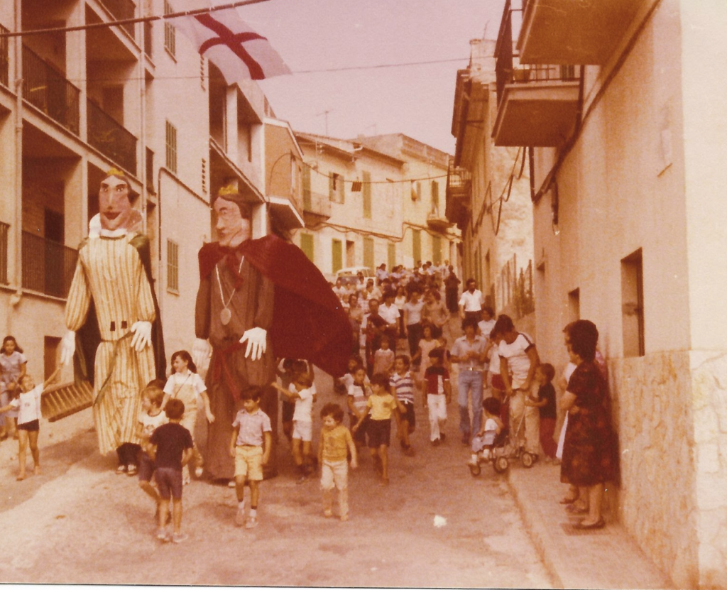 En aquest context, va néixer la idea de construir un gegant i una geganta, que es convertirien en el rei i la reina del poble. La seva elaboració va ser totalment artesanal: primer es va crear una base de reixa per donar forma, i després es varen anar afegint capes de paper i cola fins a modelar els caps. L’estructura de fusta i el vestuari completaven unes figures que sortirien a ballar pels carrers durant les festes, en animats passacarrers que convidaven tothom a participar-hi.